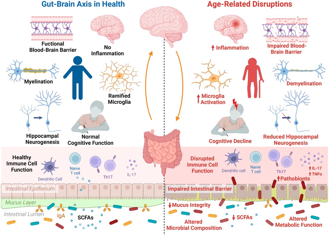 老化は、腸内細菌叢の中心となる菌種の減少、個々の人間独自の腸内細菌の増加、多様性の変化、腸内細菌叢の機能の変化を起こしますが、健全な腸内細菌叢を保つことが脳の健康にとっても重要です。